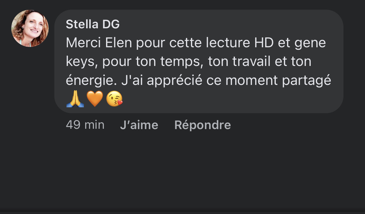 C’est une lecture de ta séquence d’activation de ton génie (aka les sphères vertes) de ton profil génétique des Gene Keys avec une belle dose de Human Design.